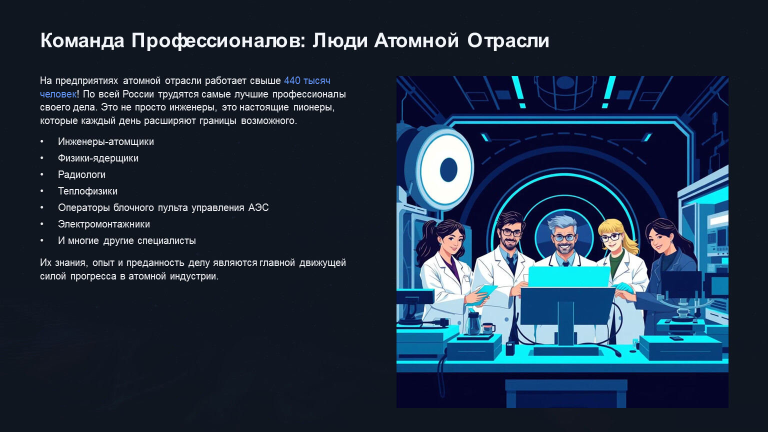 На предприятиях атомной отрасли работает свыше 440 тысяч человек! По всей России трудятся самые лучшие профессионалы своего дела. Это не просто инженеры, это настоящие пионеры, которые каждый день расширяют границы возможного.