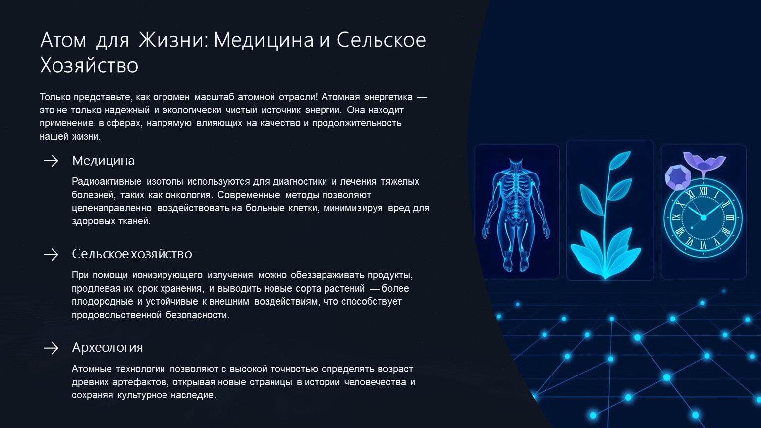 Только представьте, как огромен масштаб атомной отрасли! Атомная энергетика — это не только надёжный и экологически чистый источник энергии. Она находит применение в сферах, напрямую влияющих на качество и продолжительность нашей жизни.