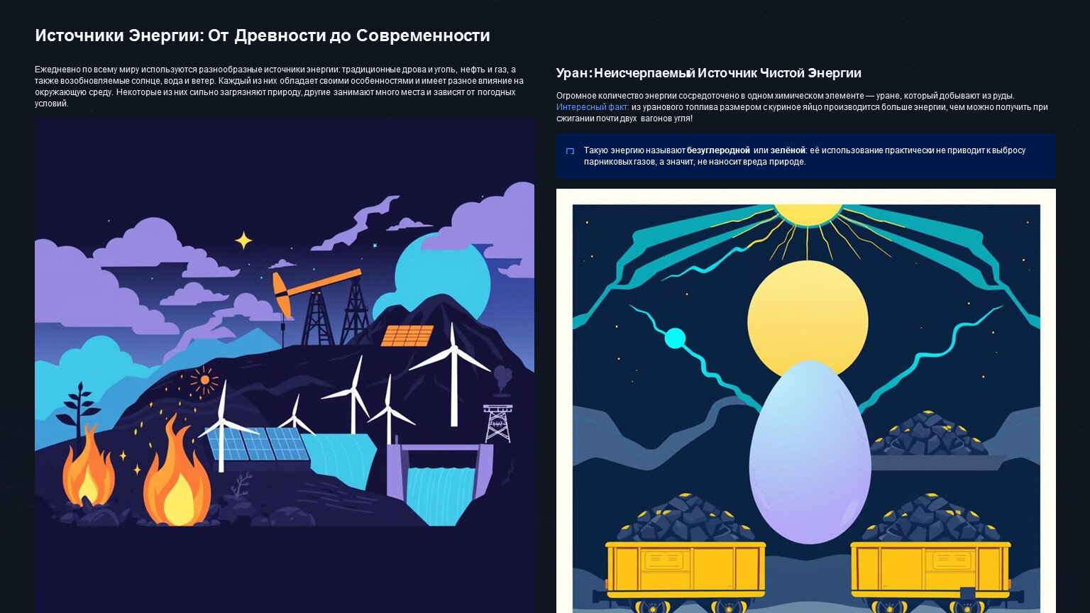 Ежедневно по всему миру используются разнообразные источники энергии: традиционные дрова и уголь, нефть и газ, а также возобновляемые солнце, вода и ветер. Каждый из них обладает своими особенностями и имеет разное влияние на окружающую среду. Некоторые из них сильно загрязняют природу, другие занимают много места и зависят от погодных условий.