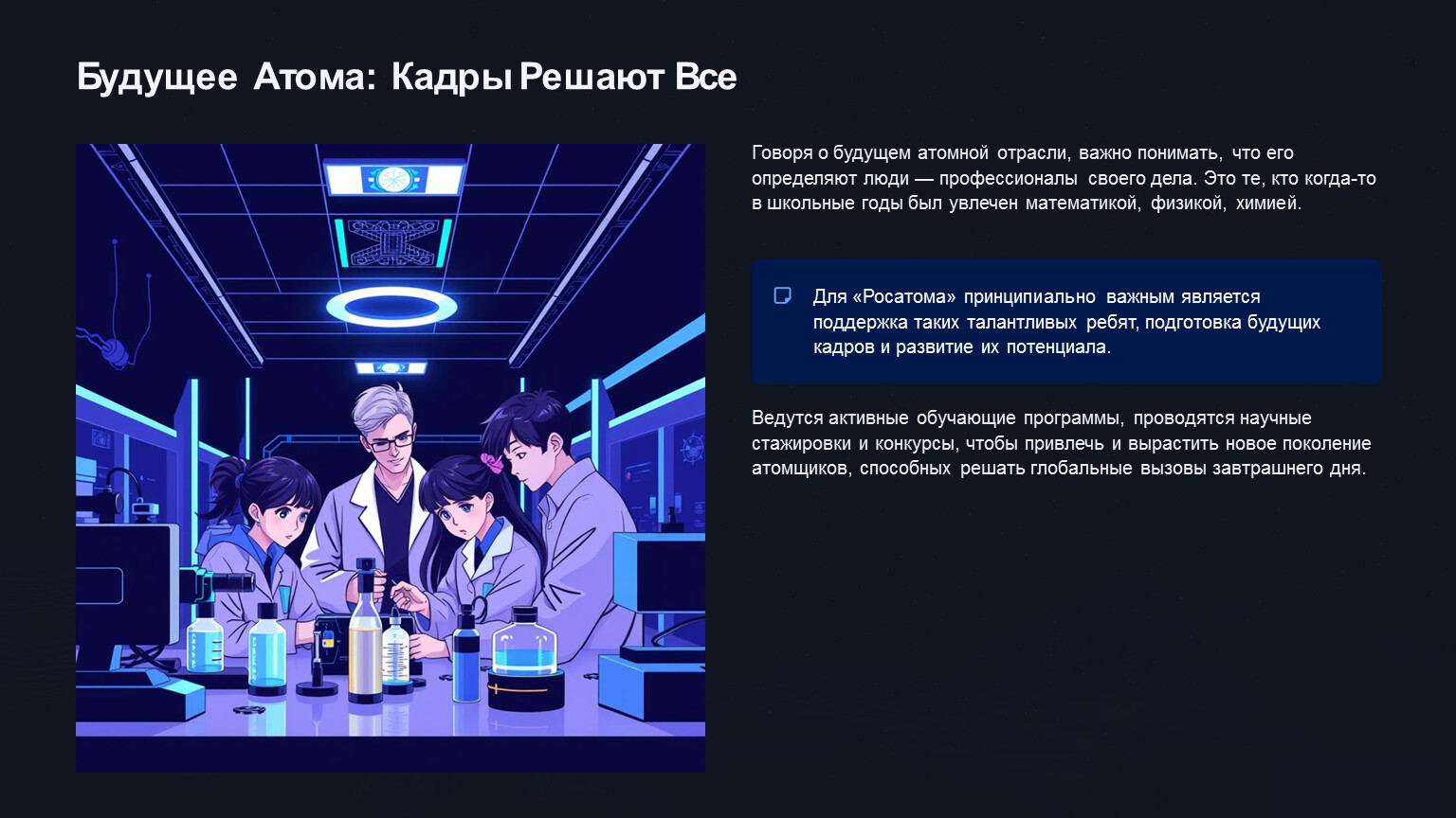 Ведутся активные обучающие программы, проводятся научные стажировки и конкурсы, чтобы привлечь и вырастить новое поколение атомщиков, способных решать глобальные вызовы завтрашнего дня.