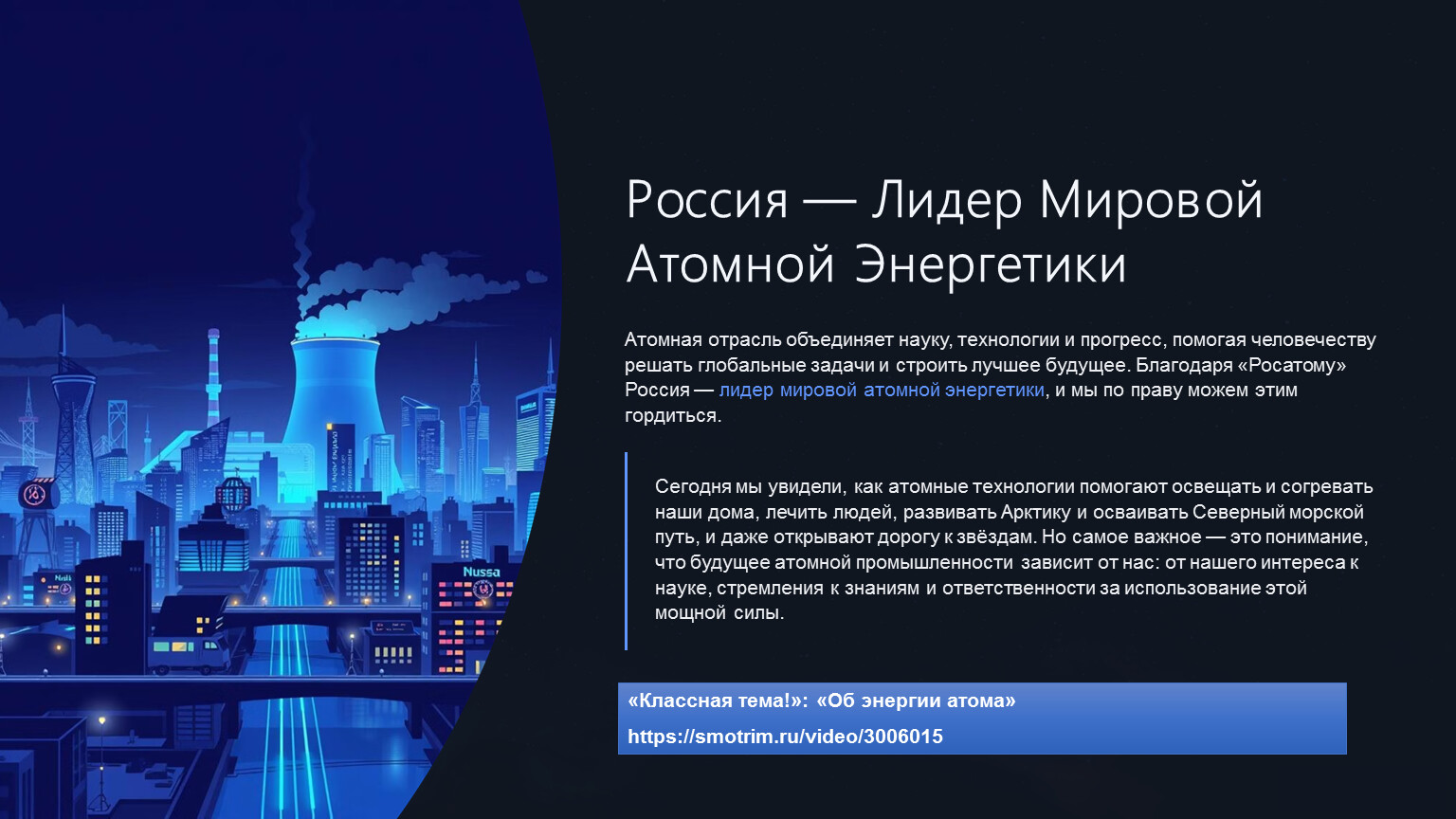 Сегодня мы увидели, как атомные технологии помогают освещать и согревать наши дома, лечить людей, развивать Арктику и осваивать Северный морской путь, и даже открывают дорогу к звёздам. Но самое важное — это понимание, что будущее атомной промышленности зависит от нас: от нашего интереса к науке, стремления к знаниям и ответственности за использование этой мощной силы.