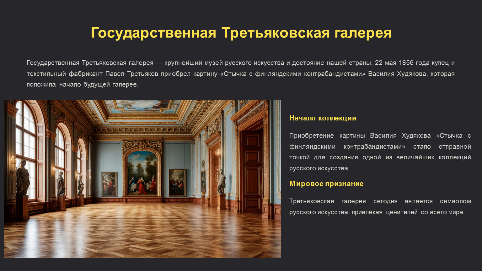 Государственная Третьяковская галерея — крупнейший музей русского искусства и достояние нашей страны. 22 мая 1856 года купец и текстильный фабрикант Павел Третьяков приобрел картину «Стычка с финляндскими контрабандистами» Василия Худякова, которая положила начало будущей галерее.