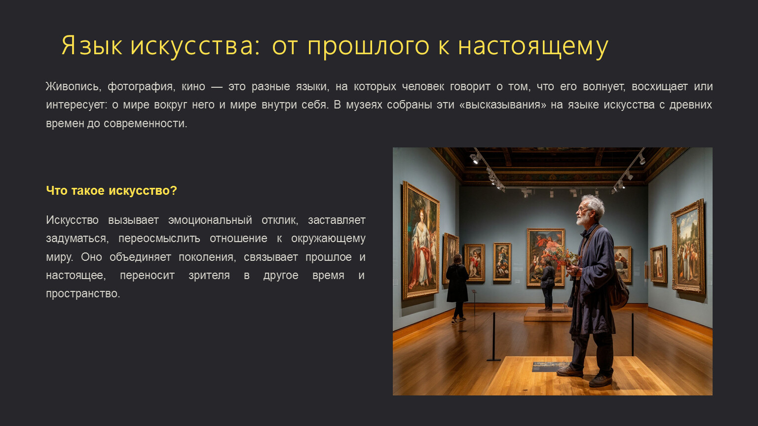 Живопись, фотография, кино — это разные языки, на которых человек говорит о том, что его волнует, восхищает или интересует: о мире вокруг него и мире внутри себя. В музеях собраны эти «высказывания» на языке искусства с древних времен до современности.