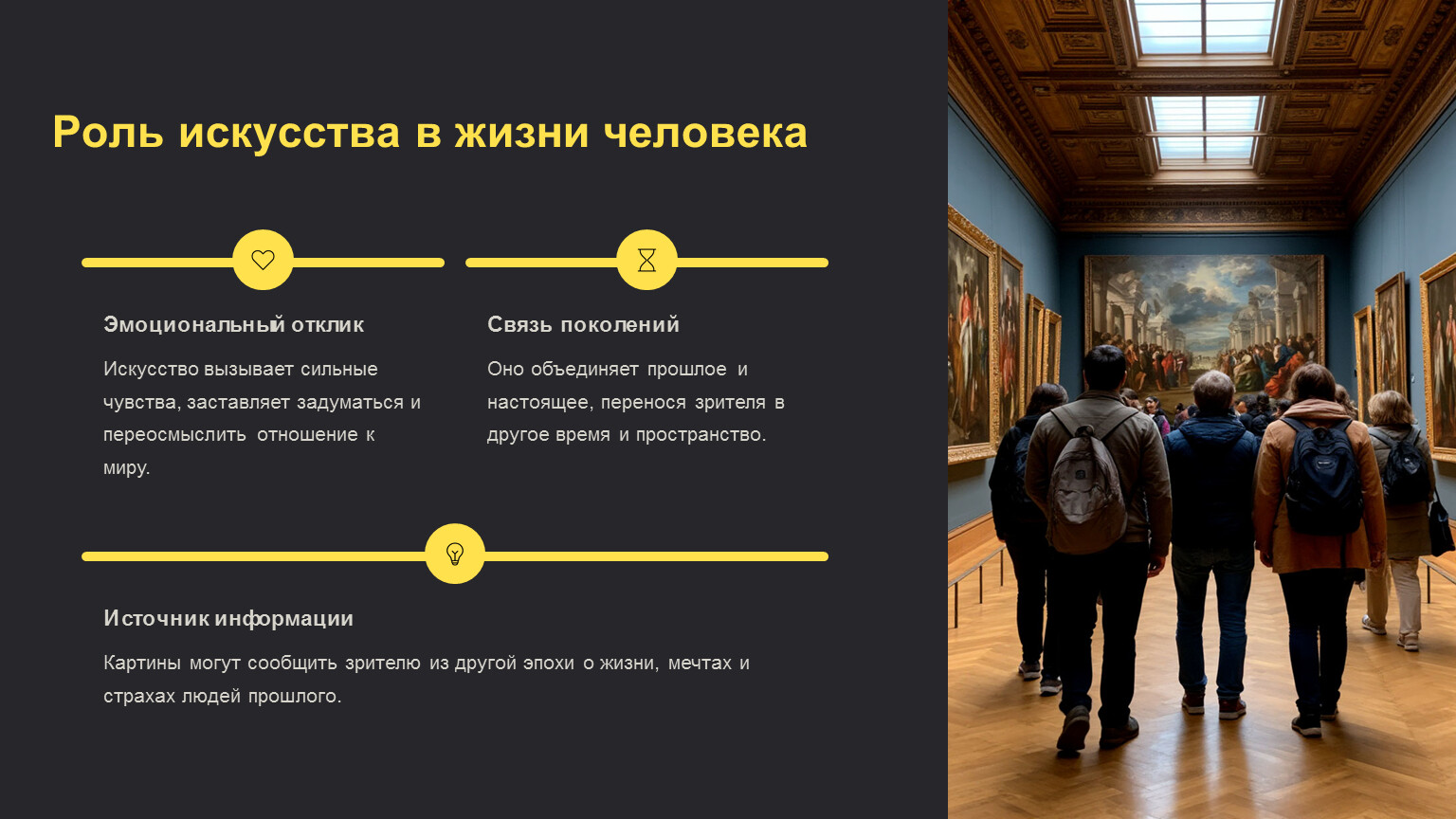Искусство вызывает эмоциональный отклик, заставляет задуматься, переосмыслить отношение к окружающему миру. Оно объединяет поколения, связывает прошлое и настоящее, переносит зрителя в другое время и пространство.
