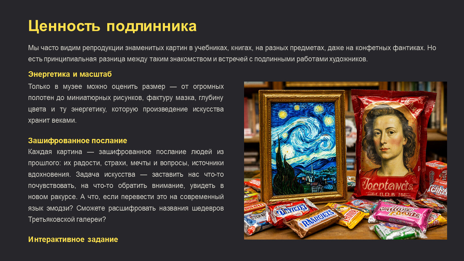 Мы часто видим репродукции знаменитых картин в учебниках, книгах, на разных предметах, даже на конфетных фантиках. Но есть принципиальная разница между таким знакомством и встречей с подлинными работами художников.