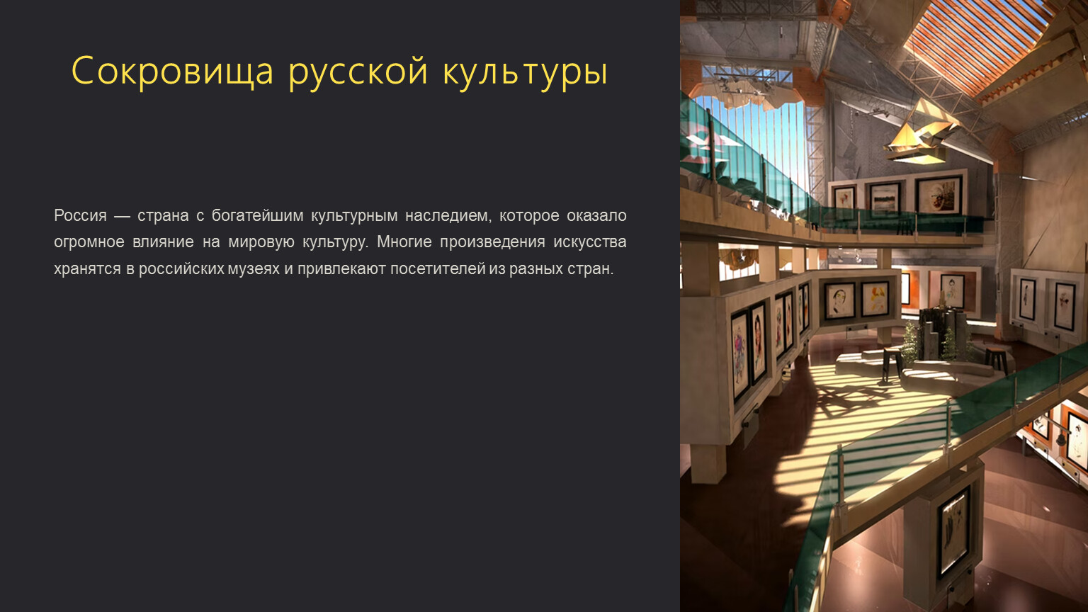 Россия — страна с богатейшим культурным наследием, которое оказало огромное влияние на мировую культуру. Многие произведения искусства хранятся в российских музеях и привлекают посетителей из разных стран.