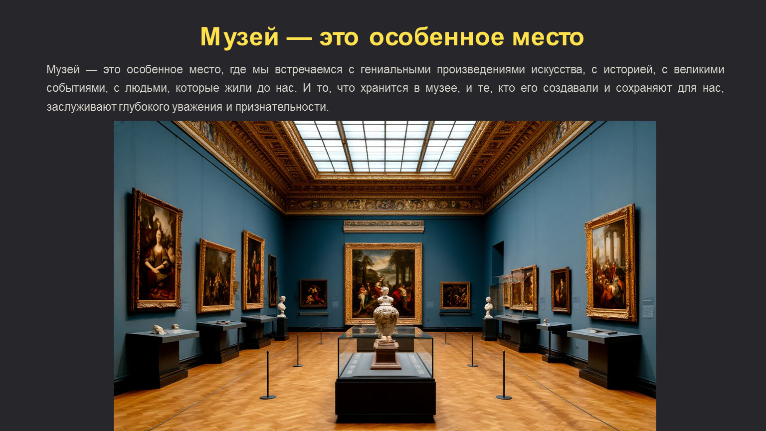 Музей — это особенное место, где мы встречаемся с гениальными произведениями искусства, с историей, с великими событиями, с людьми, которые жили до нас. И то, что хранится в музее, и те, кто его создавали и сохраняют для нас, заслуживают глубокого уважения и признательности.
