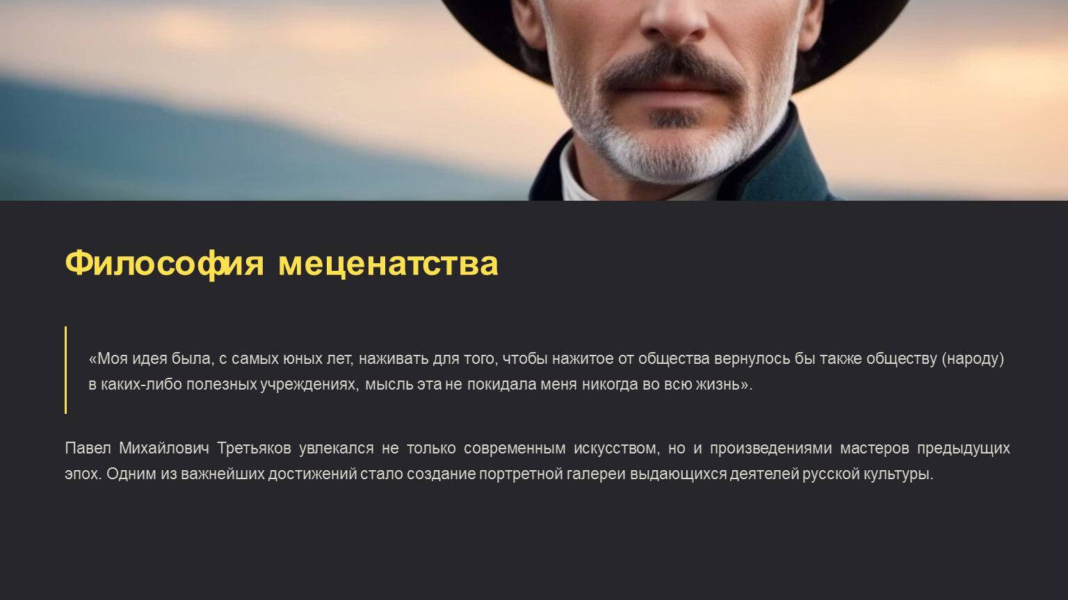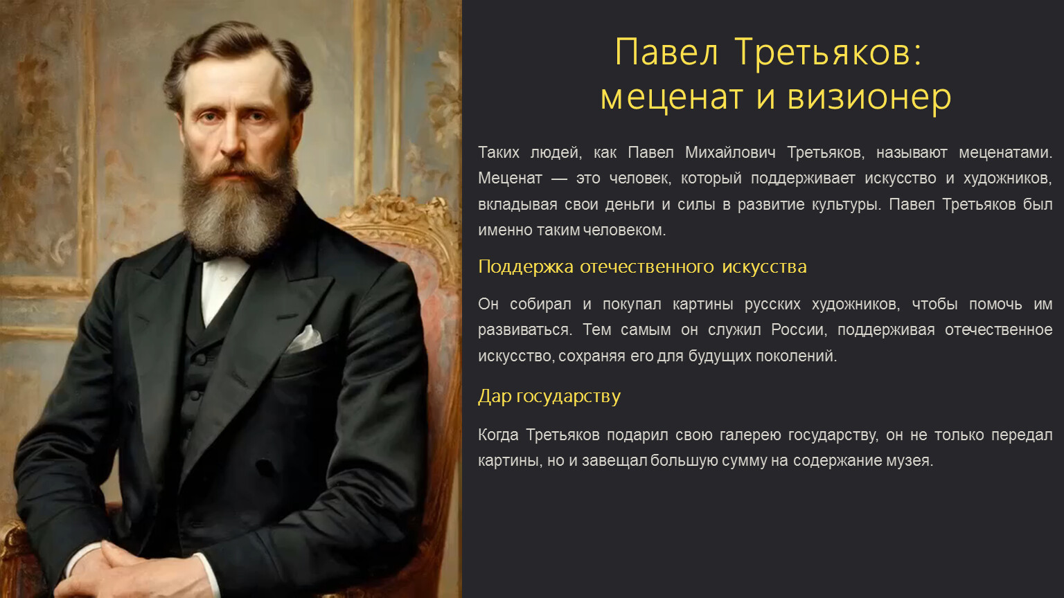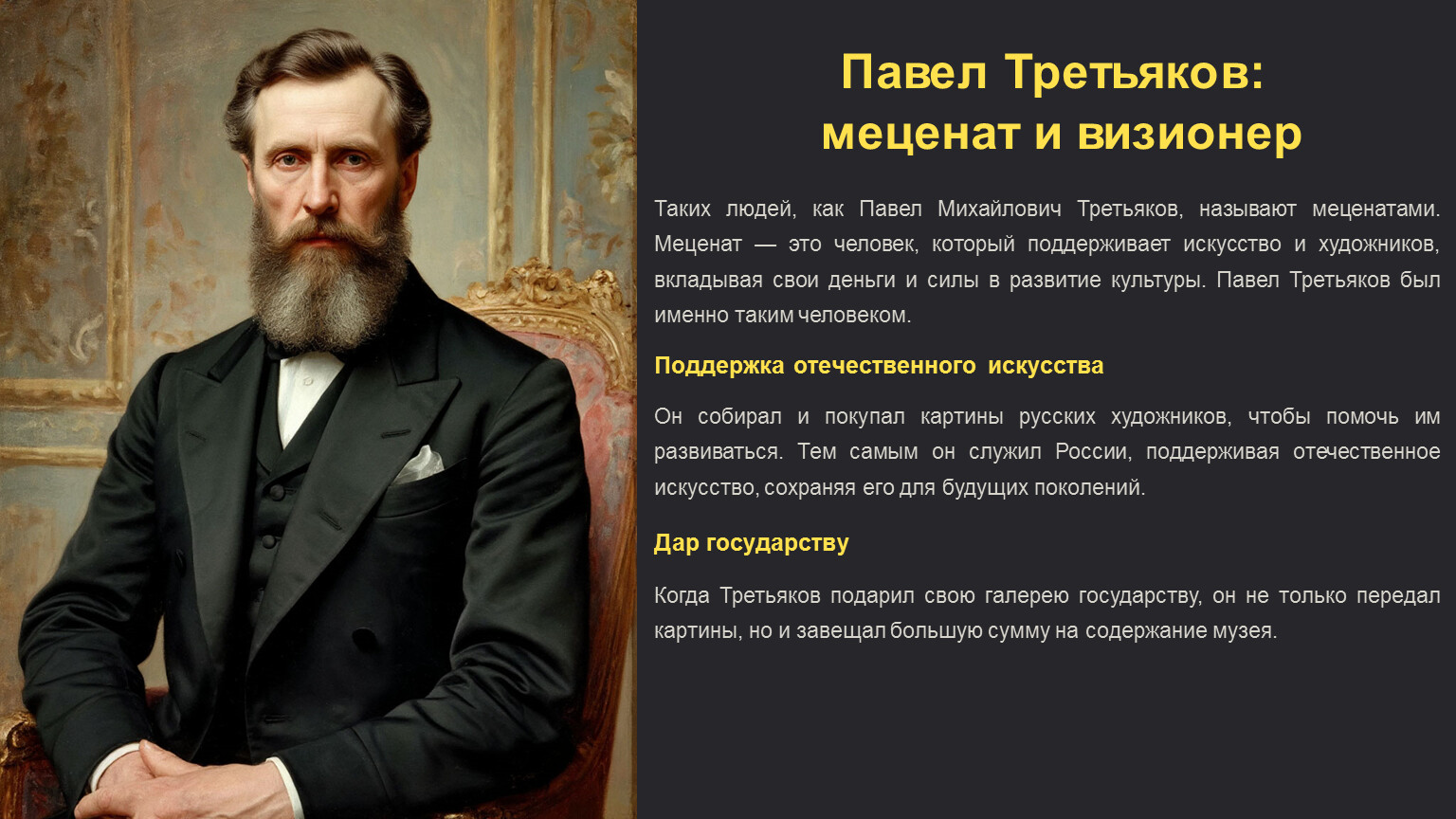 Таких людей, как Павел Михайлович Третьяков, называют меценатами. Меценат — это человек, который поддерживает искусство и художников, вкладывая свои деньги и силы в развитие культуры. Павел Третьяков был именно таким человеком.
