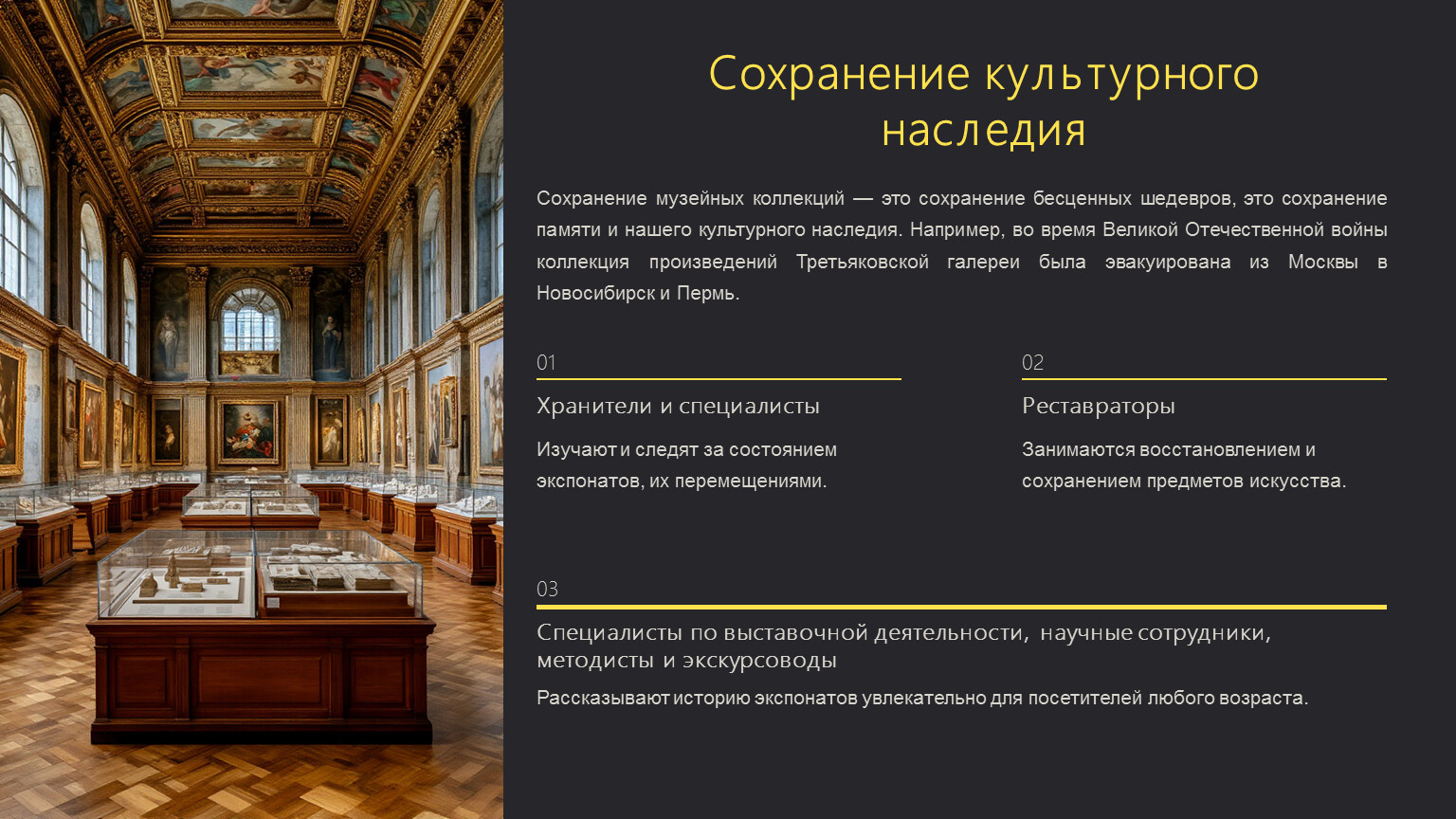 Сохранение музейных коллекций — это сохранение бесценных шедевров, это сохранение памяти и нашего культурного наследия. Например, во время Великой Отечественной войны коллекция произведений Третьяковской галереи была эвакуирована из Москвы в Новосибирск и Пермь.