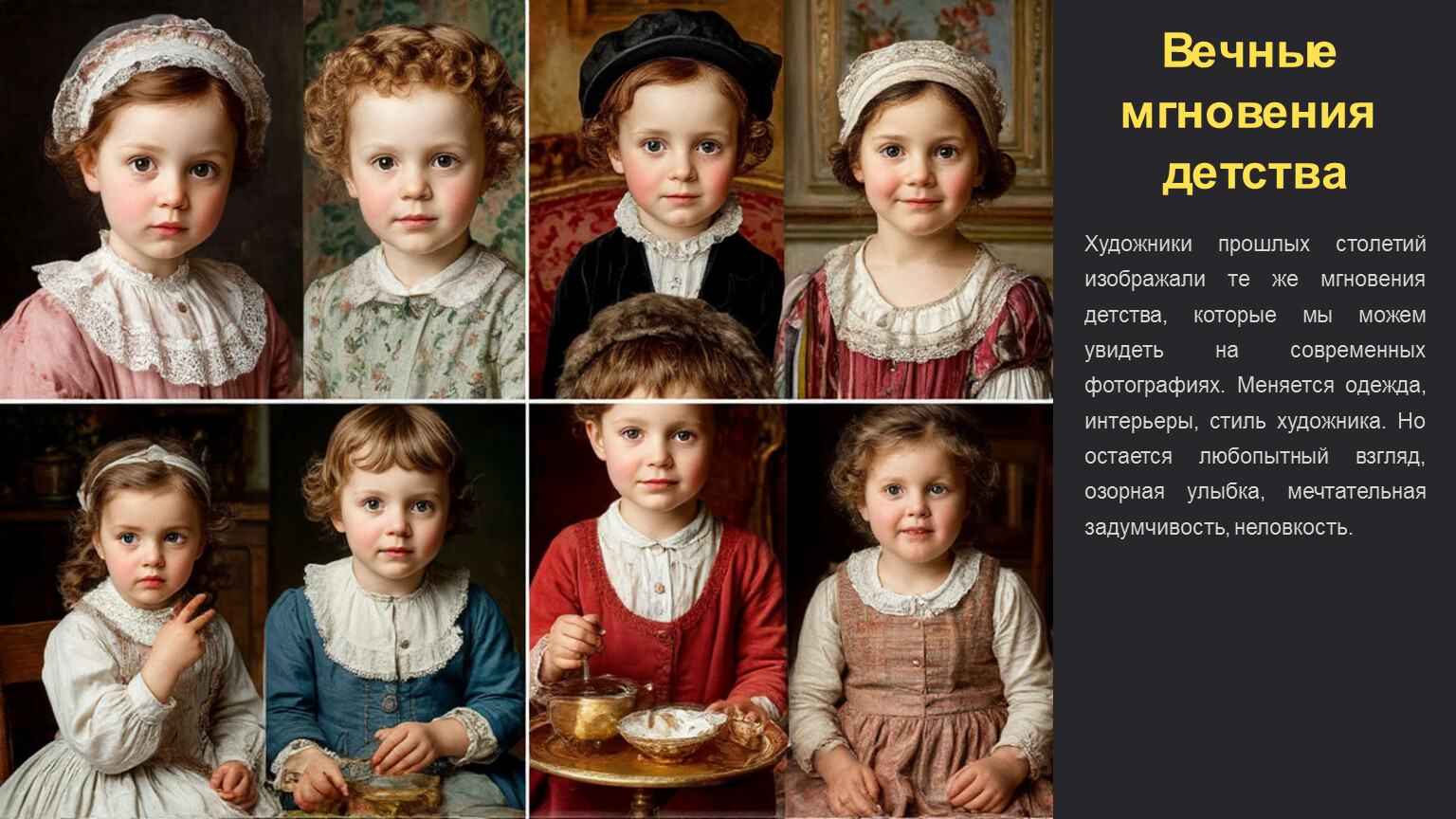 Художники прошлых столетий изображали те же мгновения детства, которые мы можем увидеть на современных фотографиях. Меняется одежда, интерьеры, стиль художника. Но остается любопытный взгляд, озорная улыбка, мечтательная задумчивость, неловкость.