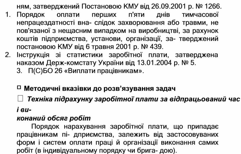 13. Порядок оплати перших п'яти днів тимчасової непрацездатності вна- слідок захворювання або травми, не пов'язаної з нещасним випадком на виробництві, за рахунок коштів підприємства, установи, організації, за- тверджений постановою КМУ від 6 травня 2001 р. № 439.