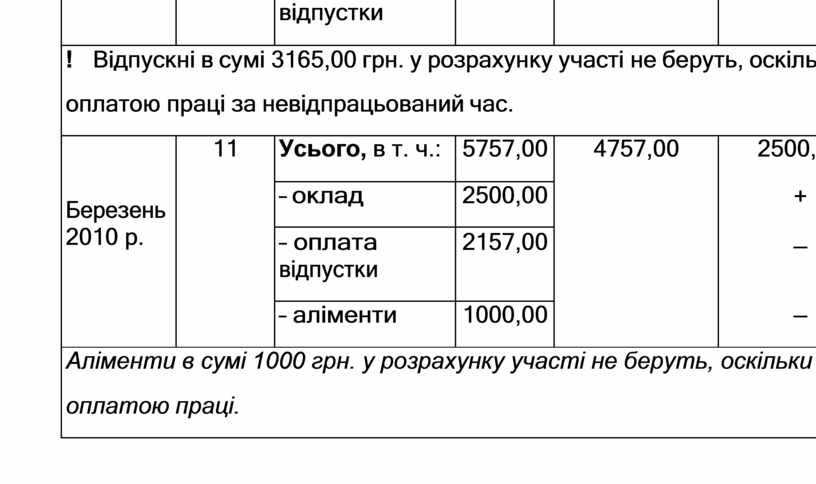 ! Відпускні в сумі 3165,00 грн. у розрахунку участі не беруть, оскільки є оплатою праці за невідпрацьований час. |