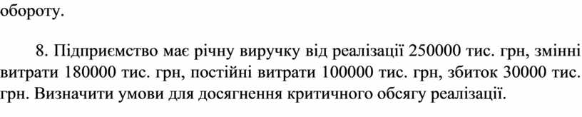 8. Підприємство має річну виручку від реалізації 250000 тис. грн, змінні витрати 180000 тис. грн, постійні витрати 100000 тис. грн, збиток 30000 тис. грн. Визначити умови для досягнення критичного обсягу реалізації.