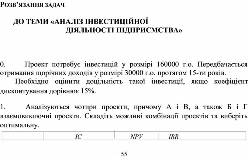 0. Проект потребує інвестицій у розмірі 160000 г.о. Передбачається отримання щорічних доходів у розмірі 30000 г.о. протягом 15-ти років.