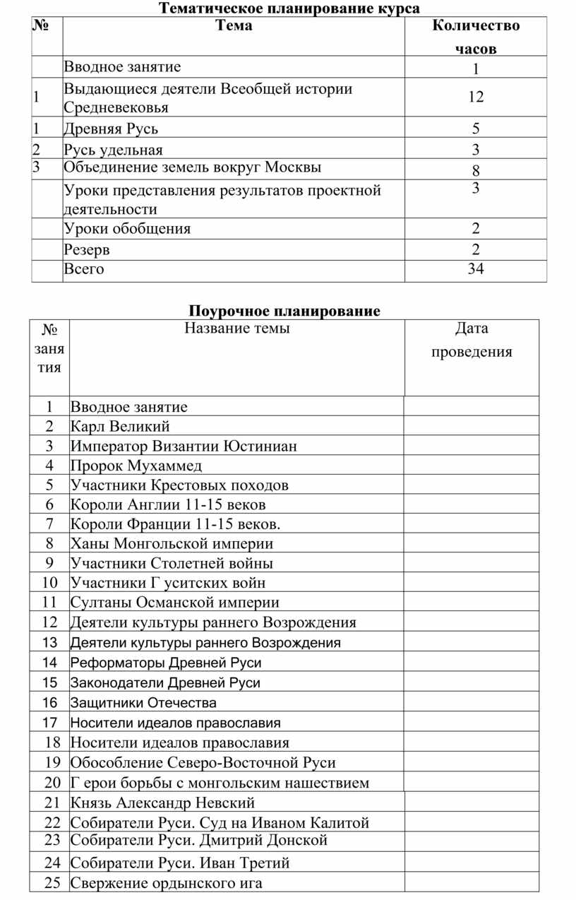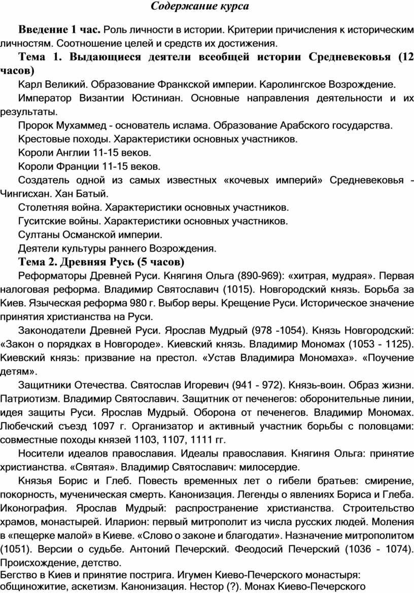 Курс предполагает изучение жизни и деятельности выдающихся исторических личностей всеобщей и российской истории Средневековья и рассчитан на 34 учебных часа.