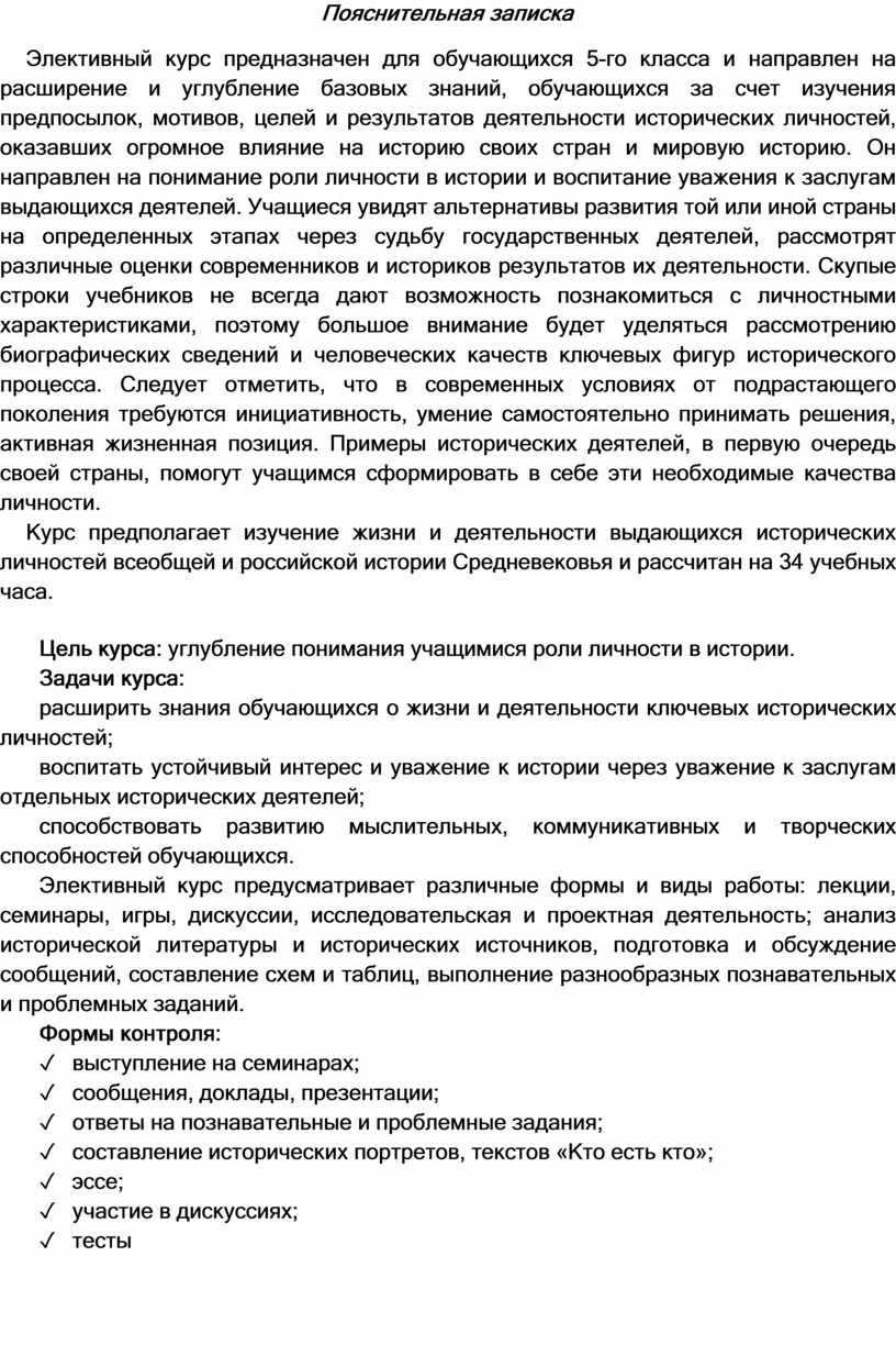 Элективный курс предназначен для обучающихся 5-го класса и направлен на расширение и углубление базовых знаний, обучающихся за счет изучения предпосылок, мотивов, целей и результатов деятельности исторических личностей, оказавших огромное влияние на историю своих стран и мировую историю. Он направлен на понимание роли личности в истории и воспитание уважения к заслугам выдающихся деятелей. Учащиеся увидят альтернативы развития той или иной страны на определенных этапах через судьбу государственных деятелей, рассмотрят различные оценки современников и историков результатов их деятельности. Скупые строки учебников не всегда дают возможность познакомиться с личностными характеристиками, поэтому большое внимание будет уделяться рассмотрению биографических сведений и человеческих качеств ключевых фигур исторического процесса. Следует отметить, что в современных условиях от подрастающего поколения требуются инициативность, умение самостоятельно принимать решения, активная жизненная позиция. Примеры исторических деятелей, в первую очередь своей страны, помогут учащимся сформировать в себе эти необходимые качества личности.