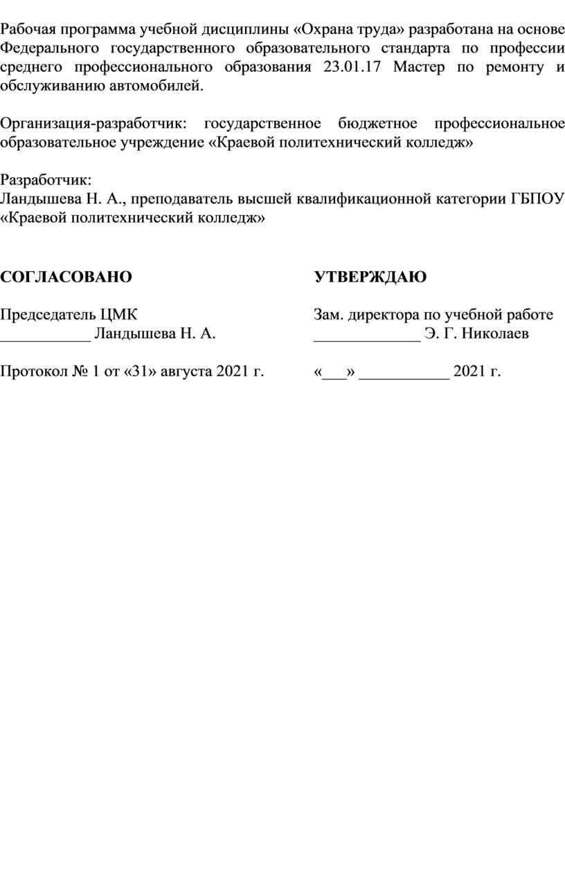Рабочая программа учебной дисциплины «Охрана труда» разработана на основе Федерального государственного образовательного стандарта по профессии среднего профессионального образования 23.01.17 Мастер по ремонту и обслуживанию автомобилей.