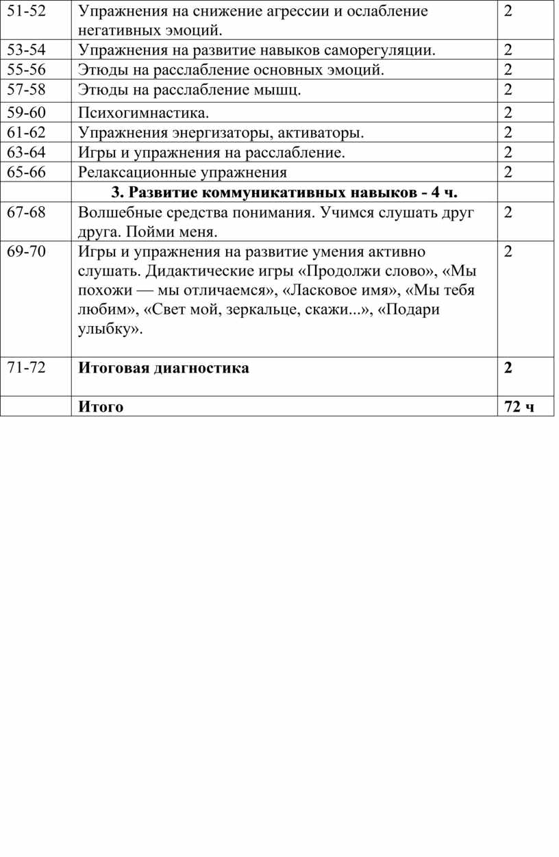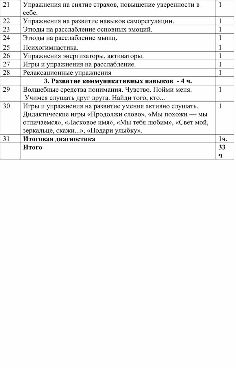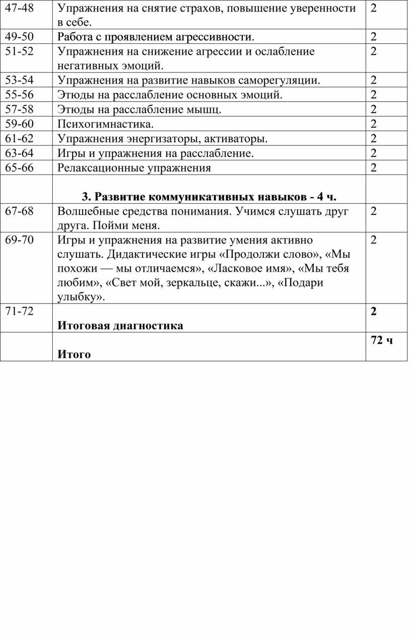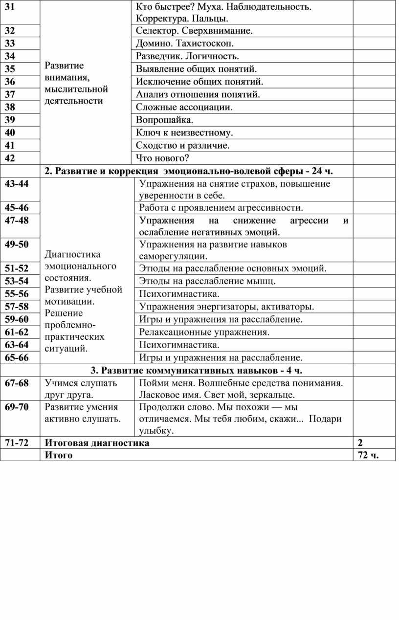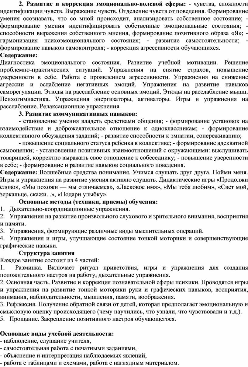 Диагностика эмоционального состояния. Развитие учебной мотивации. Решение проблемно-практических ситуаций. Упражнения на снятие страхов, повышение уверенности в себе. Работа с проявлением агрессивности. Упражнения на снижение агрессии и ослабление негативных эмоций. Упражнения на развитие навыков саморегуляции. Этюды на расслабление основных эмоций. Этюды на расслабление мышц. Психогимнастика. Упражнения энергизаторы, активаторы. Игры и упражнения на расслабление. Релаксационные упражнения.