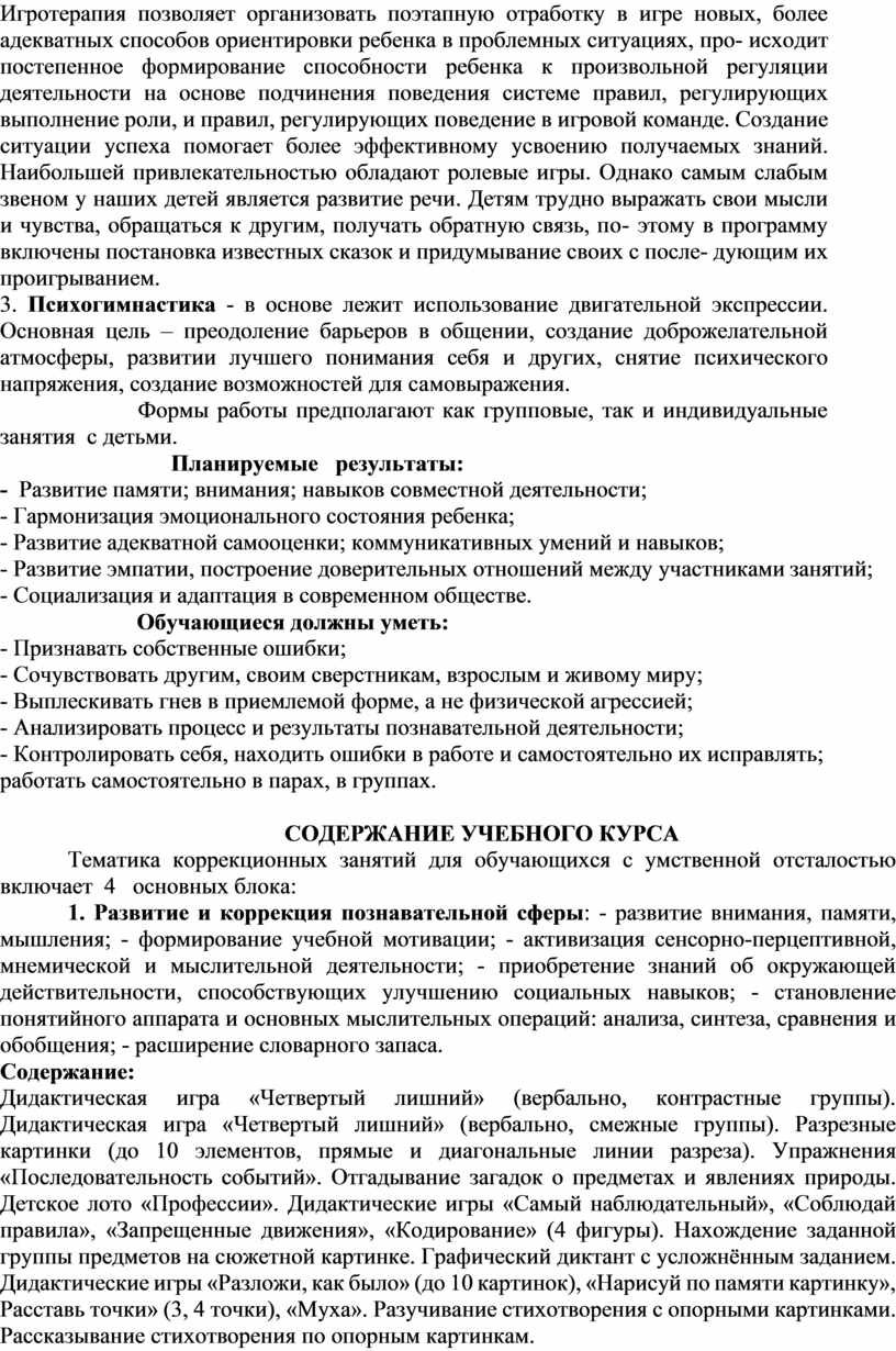 - коррекция познавательной, эмоционально-волевой сферы обучающихся с умственной отсталостью, повышение самостоятельности и расширение возможности их общения в современном обществе, через преодоление барьеров в общении, развитие лучшего понимания себя и других, создание возможностей для самовыражения.