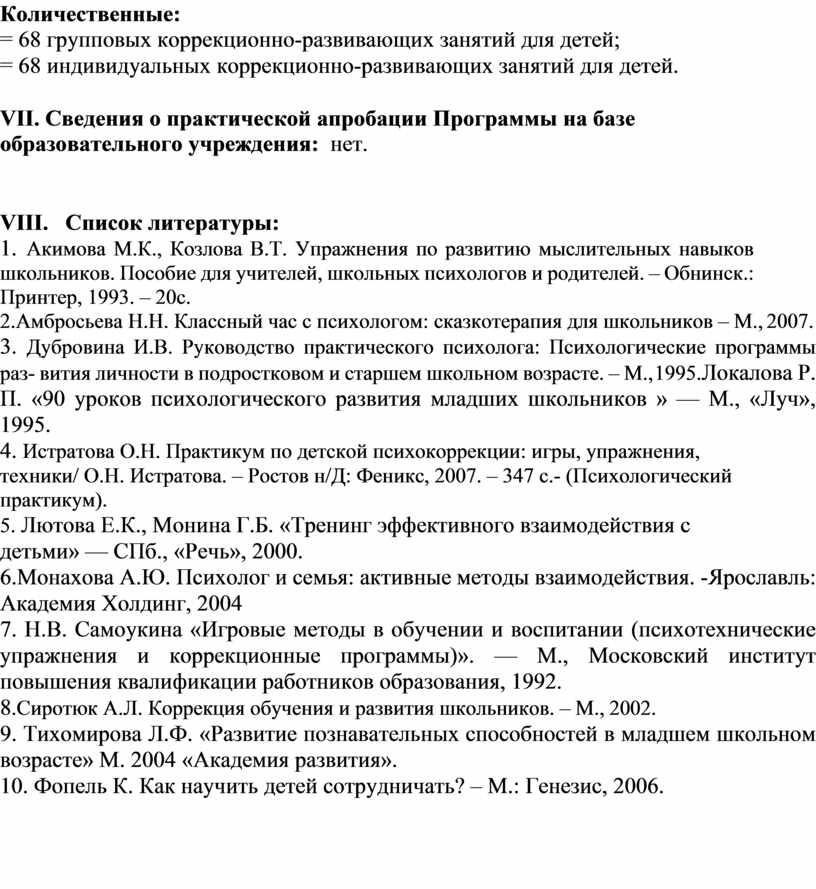 3. Дубровина И.В. Руководство практического психолога: Психологические программы раз- вития личности в подростковом и старшем школьном возрасте. – М., 1995.Локалова Р. П. «90 уроков психологического развития младших школьников » — М., «Луч», 1995.
