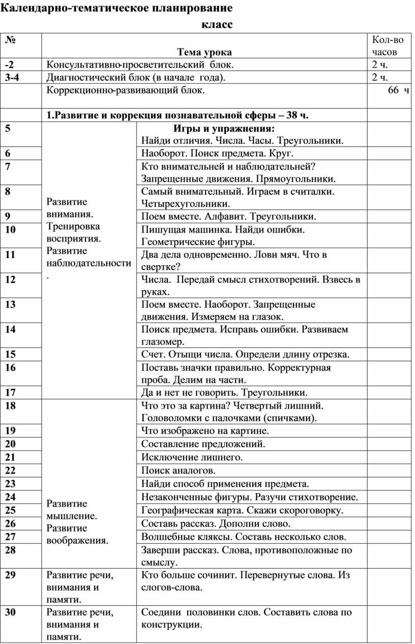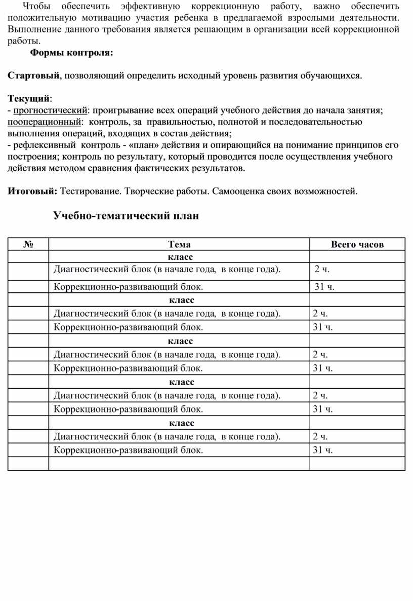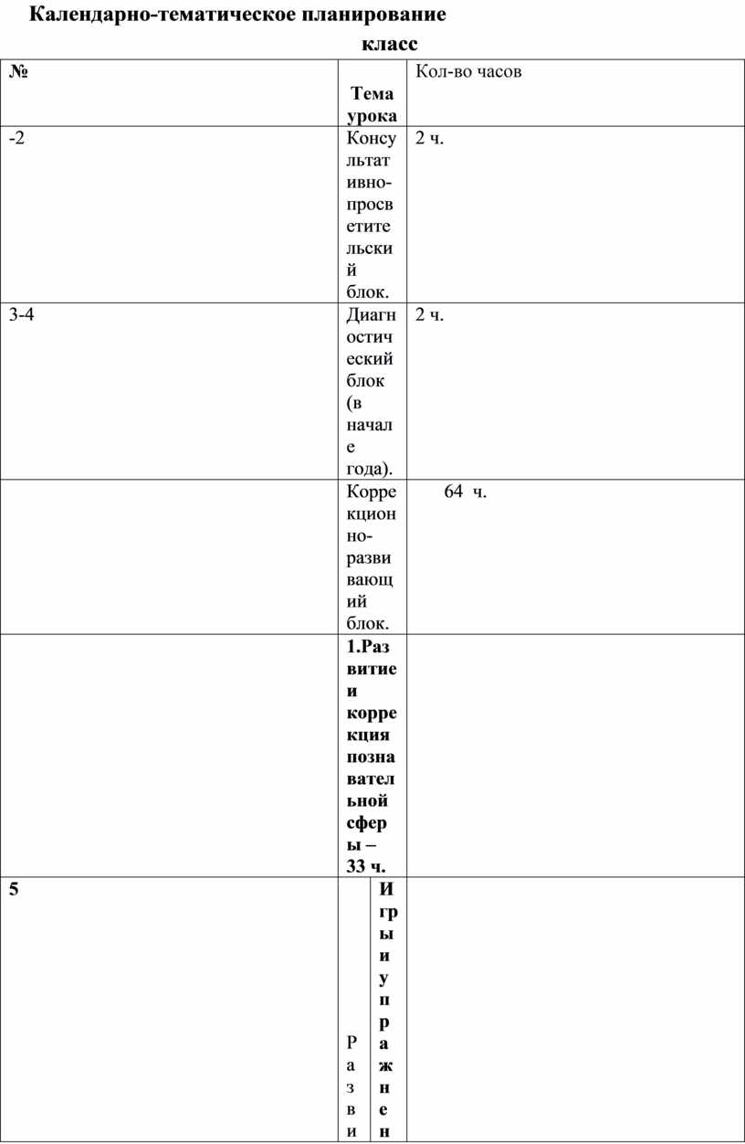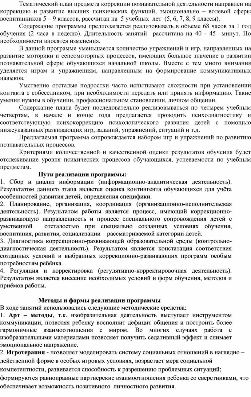 Тематический план предмета коррекции познавательной деятельности направлен на коррекцию и развитие высших психических функций, эмоционально – волевой сферы воспитанников 5 – 9 классов, рассчитан на 5 учебных лет (5, 6, 7, 8, 9 классы).