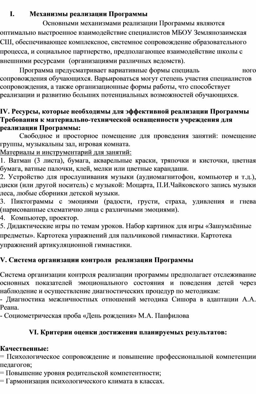Основными механизмами реализации Программы являются оптимально выстроенное взаимодействие специалистов МБОУ Землянозаимская СШ, обеспечивающее комплексное, системное сопровождение образовательного процесса, и социальное партнерство, предполагающее взаимодействие школы с внешними ресурсами (организациями различных ведомств).