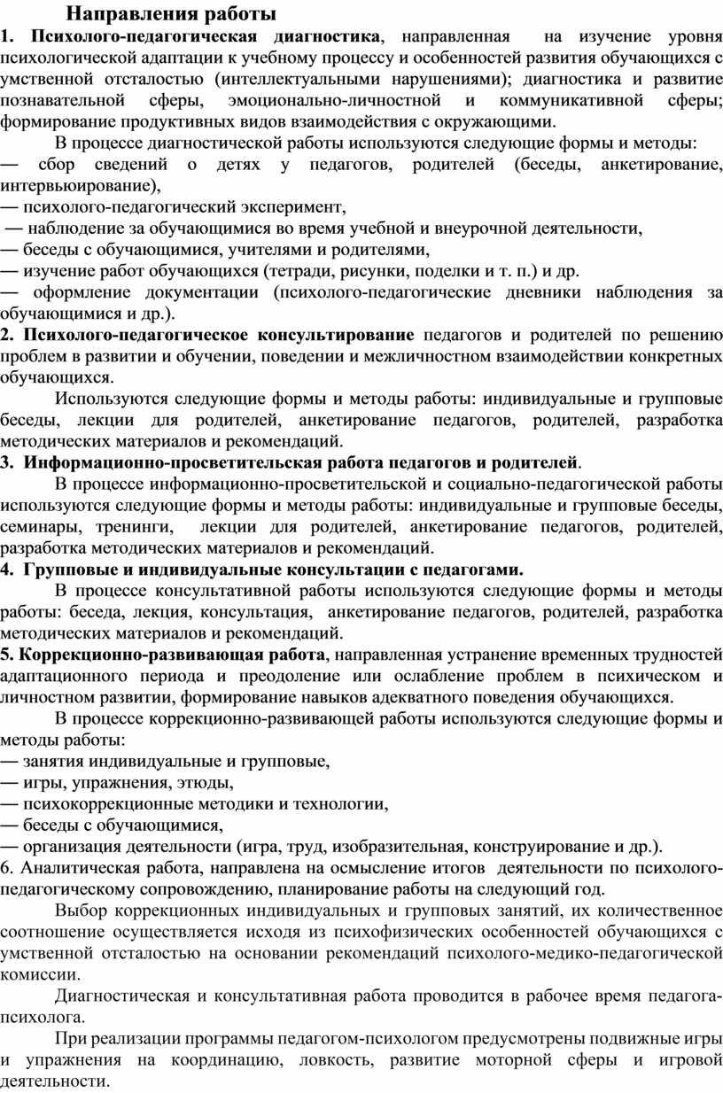 1. Психолого-педагогическая диагностика, направленная на изучение уровня психологической адаптации к учебному процессу и особенностей развития обучающихся с умственной отсталостью (интеллектуальными нарушениями); диагностика и развитие познавательной сферы, эмоционально-личностной и коммуникативной сферы; формирование продуктивных видов взаимодействия с окружающими.