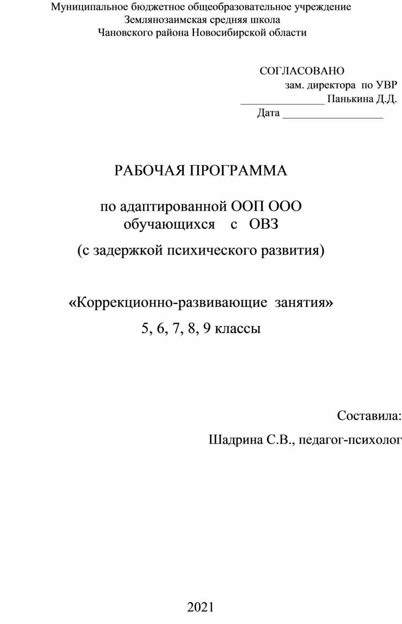 СОГЛАСОВАНО зам. директора по УВР _______________ Панькина Д.Д. Дата __________________ |