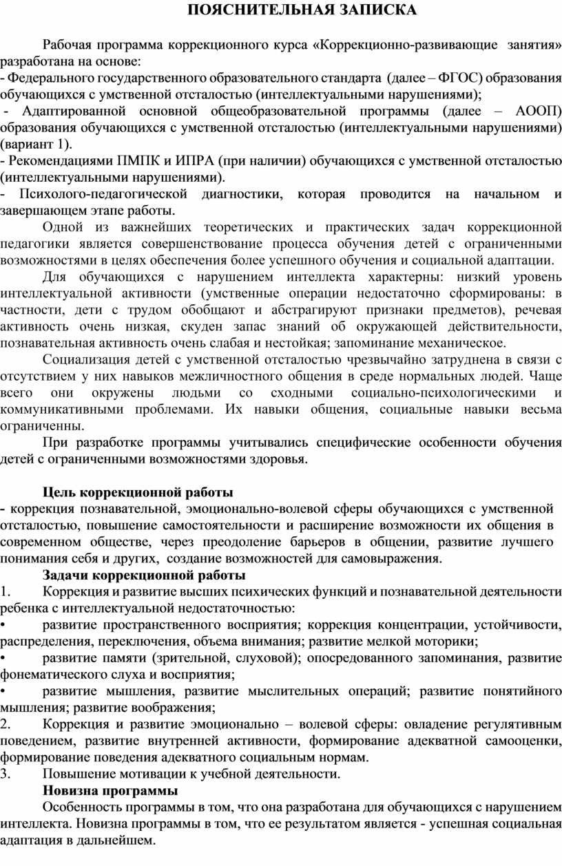 1. Коррекция и развитие высших психических функций и познавательной деятельности ребенка с интеллектуальной недостаточностью: