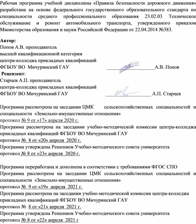 Программа рассмотрена на заседании учебно-методической комиссии центра-колледжа прикладных квалификаций ФГБОУ ВО Мичуринский ГАУ