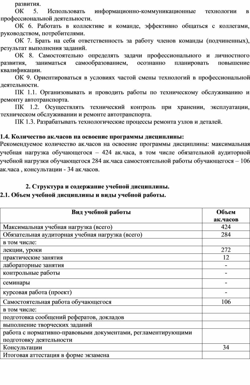 Рекомендуемое количество ак.часов на освоение программы дисциплины: максимальная учебная нагрузка обучающегося – 424 ак.часа, в том числе обязательной аудиторной учебной нагрузки обучающегося 284 ак.часа самостоятельной работы обучающегося – 106 ак.часа , консультации - 34 ак.часов.