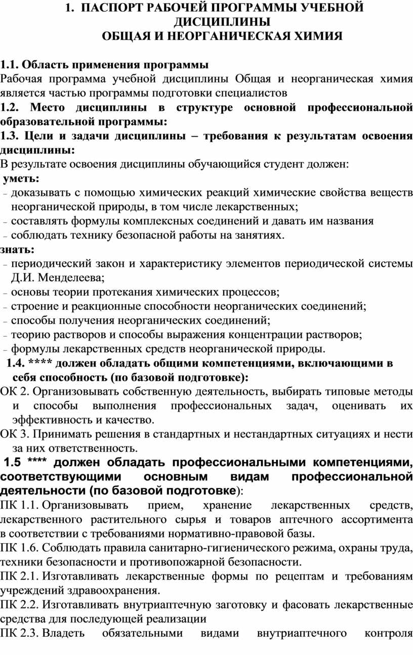 1. Паспорт рабочей программы учебной дисциплины Общая и неорганическая химия