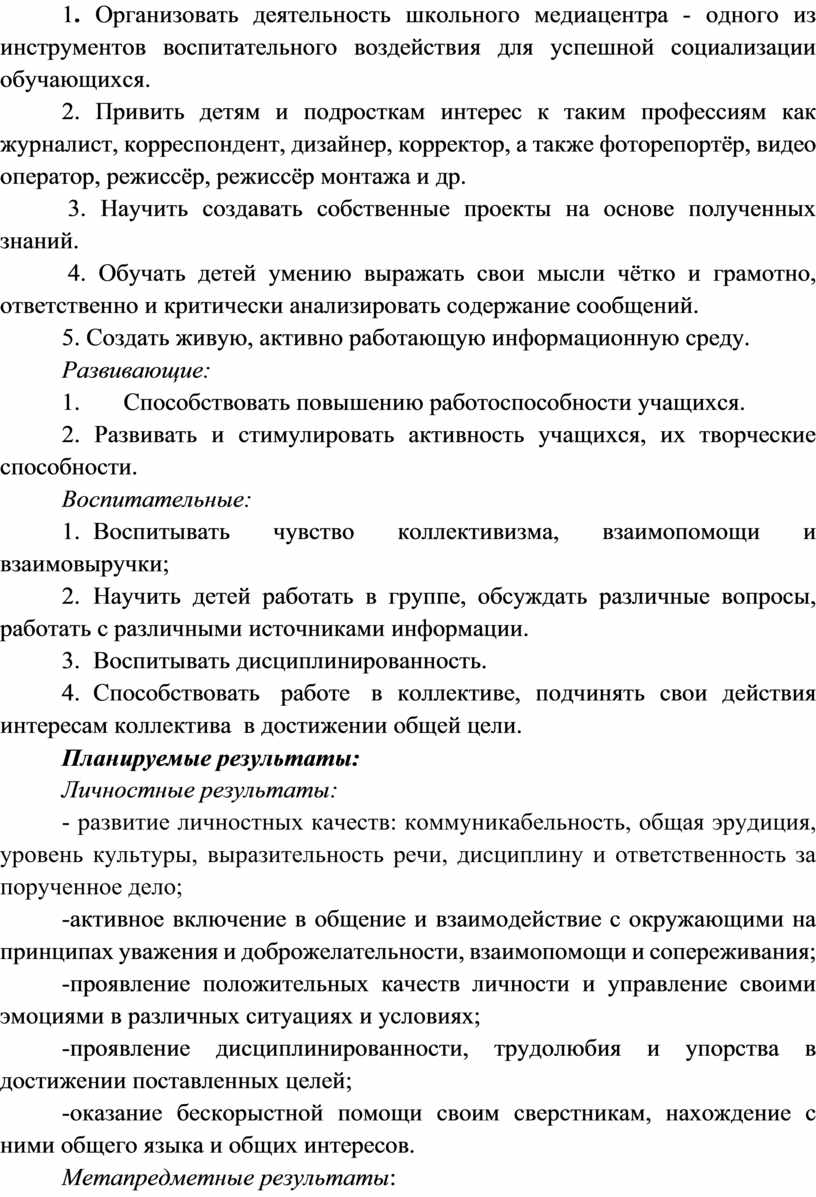 1. Организовать деятельность школьного медиацентра - одного из инструментов воспитательного воздействия для успешной социализации обучающихся.