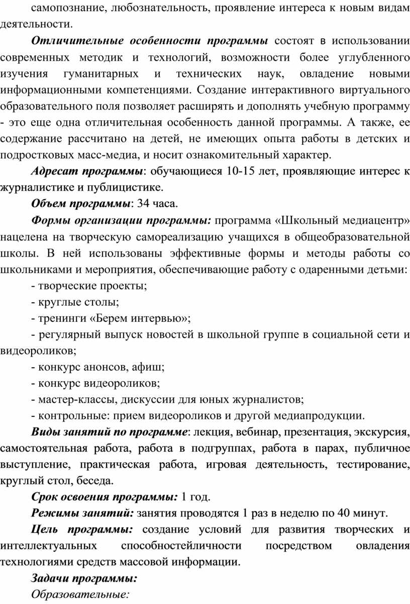 Формы организации программы: программа «Школьный медиацентр» нацелена на творческую самореализацию учащихся в общеобразовательной школы. В ней использованы эффективные формы и методы работы со школьниками и мероприятия, обеспечивающие работу с одаренными детьми: