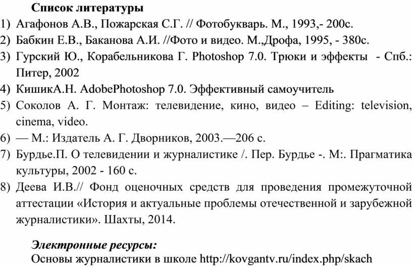 2) Бабкин Е.В., Баканова А.И. //Фото и видео. М.,Дрофа, 1995, - 380с.