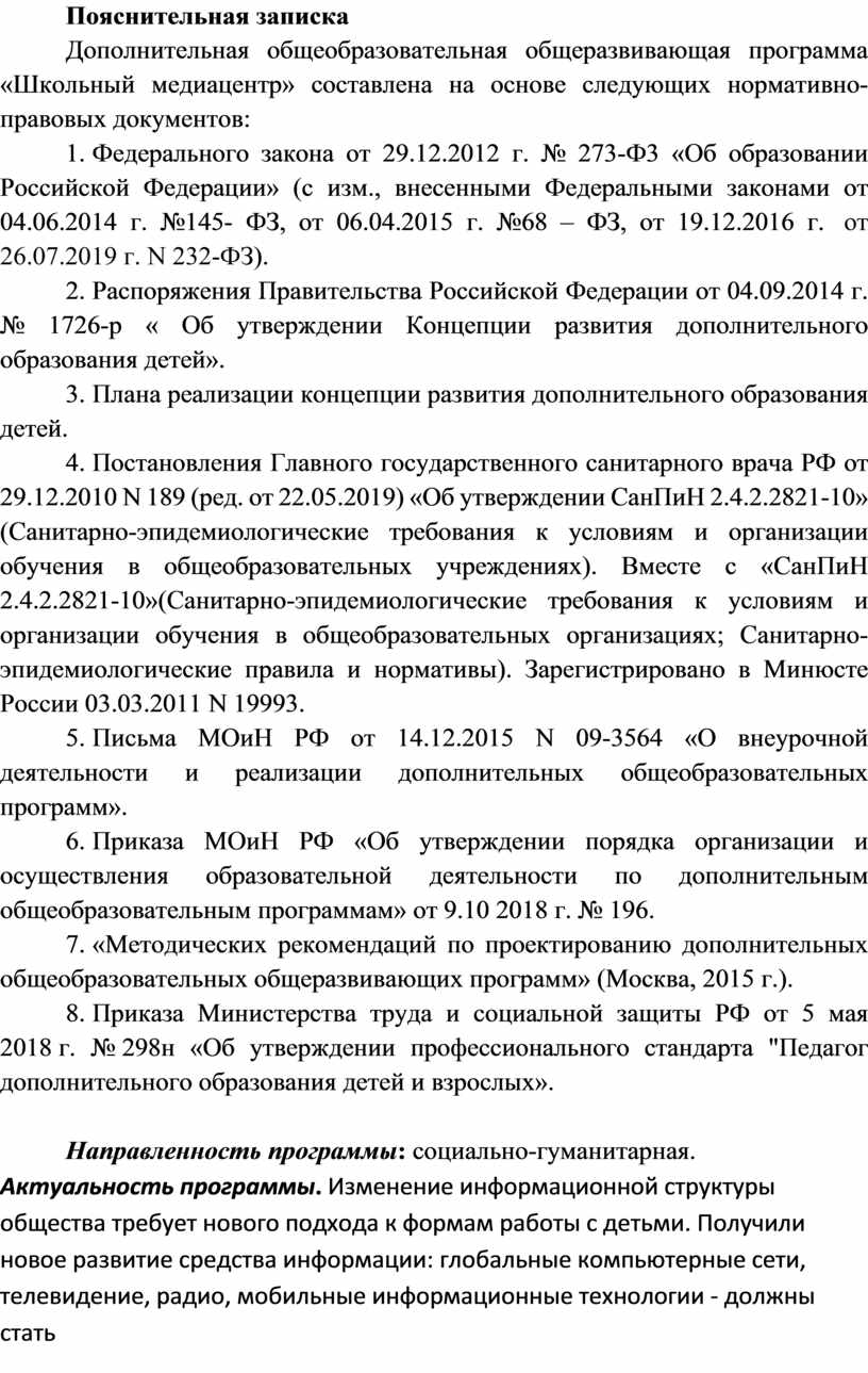 Дополнительная общеобразовательная общеразвивающая программа «Школьный медиацентр» составлена на основе следующих нормативно-правовых документов: