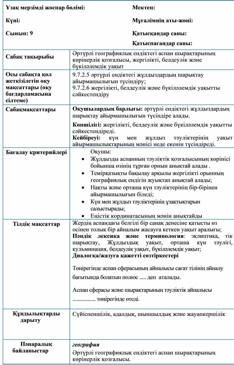 Оқушылардың барлығы: әртүрлі ендіктегі жұлдыздардың шарықтау айырмашылығын түсіндіре алады. Көпшілігі: жергілікті, белдеулік және бүкіләлемдік уақытты сәйкестендіреді. Кейбіреуі: күн мен жұлдыз тәуліктерінің уақыт айырмашылықтарының мәнісі неде екенін түсіндіреді. |