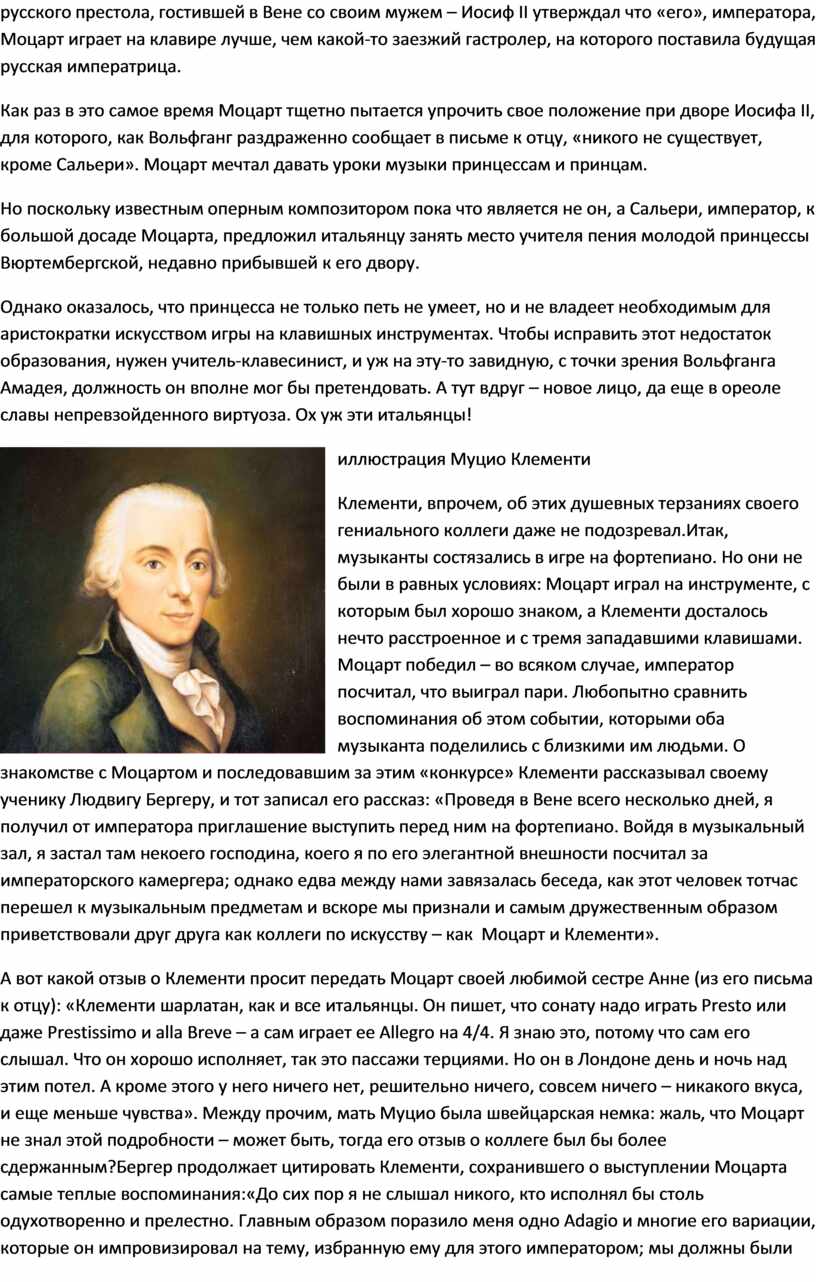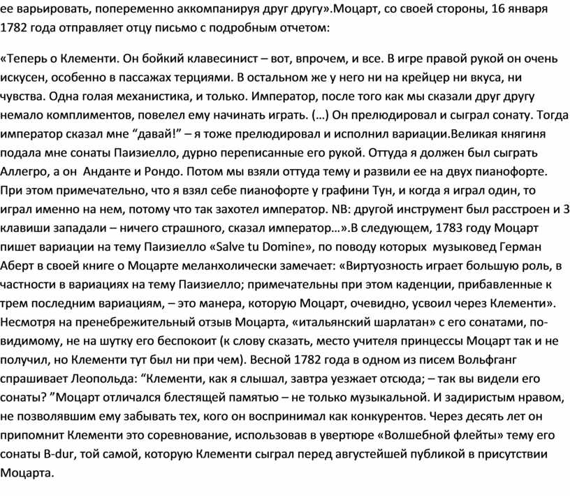 А вот какой отзыв о Клементи просит передать Моцарт своей любимой сестре Анне (из его письма к отцу): «Клементи шарлатан, как и все итальянцы. Он пишет, что сонату надо играть Presto или даже Prestissimo и alla Breve – а сам играет ее Allegro на 4/4. Я знаю это, потому что сам его слышал. Что он хорошо исполняет, так это пассажи терциями. Но он в Лондоне день и ночь над этим потел. А кроме этого у него ничего нет, решительно ничего, совсем ничего – никакого вкуса, и еще меньше чувства». Между прочим, мать Муцио была швейцарская немка: жаль, что Моцарт не знал этой подробности – может быть, тогда его отзыв о коллеге был бы более сдержанным?Бергер продолжает цитировать Клементи, сохранившего о выступлении Моцарта самые теплые воспоминания:«До сих пор я не слышал никого, кто исполнял бы столь одухотворенно и прелестно. Главным образом поразило меня одно Adagio и многие его вариации, которые он импровизировал на тему, избранную ему для этого императором; мы должны были ее варьировать, попеременно аккомпанируя друг другу».Моцарт, со своей стороны, 16 января 1782 года отправляет отцу письмо с подробным отчетом:
