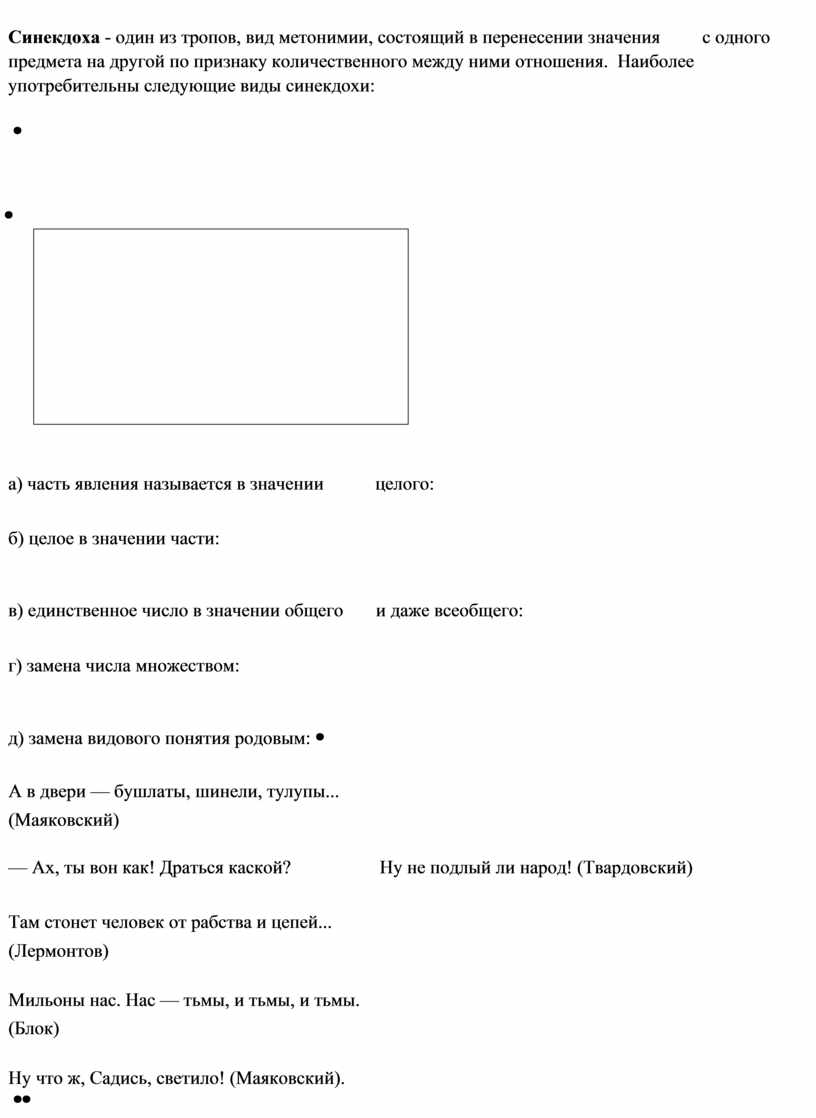 Синекдоха - один из тропов, вид метонимии, состоящий в перенесении значения с одного предмета на другой по признаку количественного между ними отношения. Наиболее употребительны следующие виды синекдохи: