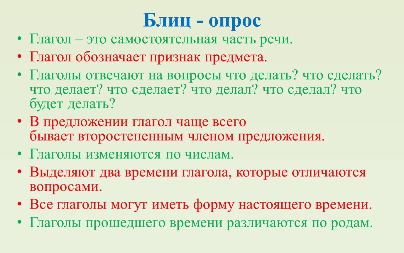 Глаголы отвечают на вопросы что делать? что сделать? что делает? что сделает? что делал? что сделал? что будет делать?