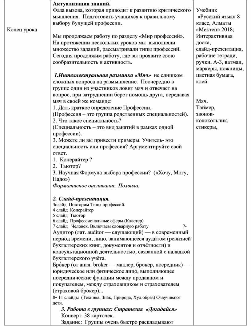 Актуализация знаний. Фаза вызова, которая приводит к развитию критического мышления. Подготовить учащихся к правильному выбору будущей профессии. Мы продолжаем работу по разделу «Мир профессий». На протяжении нескольких уроков мы выполняли множество заданий, рассматривали типы профессий. Сегодня продолжим работу, где вы проявите свою сообразительность и активность. 1.Интеллектуальная разминка «Мяч» не слишком сложных вопроса на размышление. Поочередно в группе один из участников ловит мяч и отвечает на вопрос, при затруднении берет помощь друга, передавая мяч в своей же команде: 1. Дать краткое определение Профессии. (Профессия – это группа родственных специальностей). 2. Что такое специальность? (Специальность – это вид занятий в рамках одной профессии). 3. Можете ли вы привести примеры. Учитель- это специальность или профессия? Аргументируйте свой ответ. 1. Коперайтер ? 2. Тьютор? 3. Научная Формула выбора профессии? («Хочу, Могу, Надо») Формативное оценивание. Похвала. 2. Слайд-презентация. 3слайд Повторим Типы профессий. 4 слайд Коперайтер 5 слайд Тьютор 6 слайд Профессиональные сферы (Кластер) 7 слайд Человек. Включаем словарную работу 7- Аудитор (лат. auditor — слушающий) — в современный период времени, лицо, занимающееся аудитом (ревизией бухгалтерских книг, документов и отчётности) и консультационной деятельностью, связанной с наладкой бухгалтерского учёта. Бро́кер (от англ. broker — маклер, брокер, посредник) — юридическое или физическое лицо, выполняющее посреднические функции между продавцом и покупателем, между страховщиком и страхователем (страховой брокер)... 8- 11 слайды (Техника, Знак, Природа, Худ.образ) Озвучивают дети. 3. Работа в группах: Стратегия «Догадайся» Конверт. 38 карточек. Задание: Группы очень быстро раскладывают карточки по типам профессий (профессиональным сферам) Время засекаю, завершение задания по звонку-колокольчику. Формативное оценивание. Наблюдение. 5. Работа в группах: На доске «Ромашка Блумма» Один учащийся из группы выбирает два лепестка. (6 лепестков с типами профессий, 1 лепесток свободный выбор) Задание: 5. Составление Диаграммы Венна, выбрав два типа профессий. Бумага А-3, ватман, маркеры, фломастеры, карандаши, клей, цветная бумага. Выступление спикеров. Презентация работ по 1 минуте. Время выполнения на мониторе Таймер 6 минут.