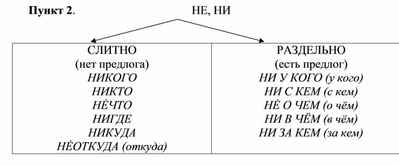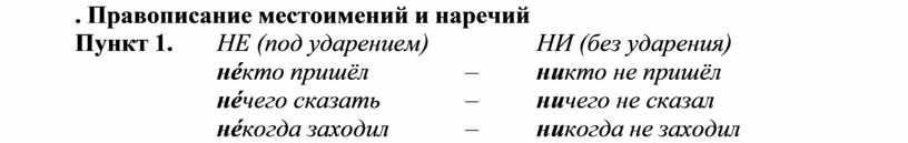 Пункт 1. НЕ (под ударением) НИ (без ударения) нéкто пришёл – никто не пришёл нéчего сказать – ничего не сказал нéкогда заходил – никогда не заходил
