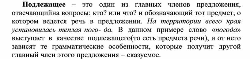 Подлежащее – это один из главных членов предложения, отвечающий на вопросы: кто? или что? и обозначающий тот предмет, о котором ведется речь в предложении. На территории всего края установилась теплая пого- да. В данном примере слово «погода» выступает в качестве подлежащего (то есть предмета речи), и от него зависят те грамматические особенности, которые получит другой главный член этого предложения – сказуемое.