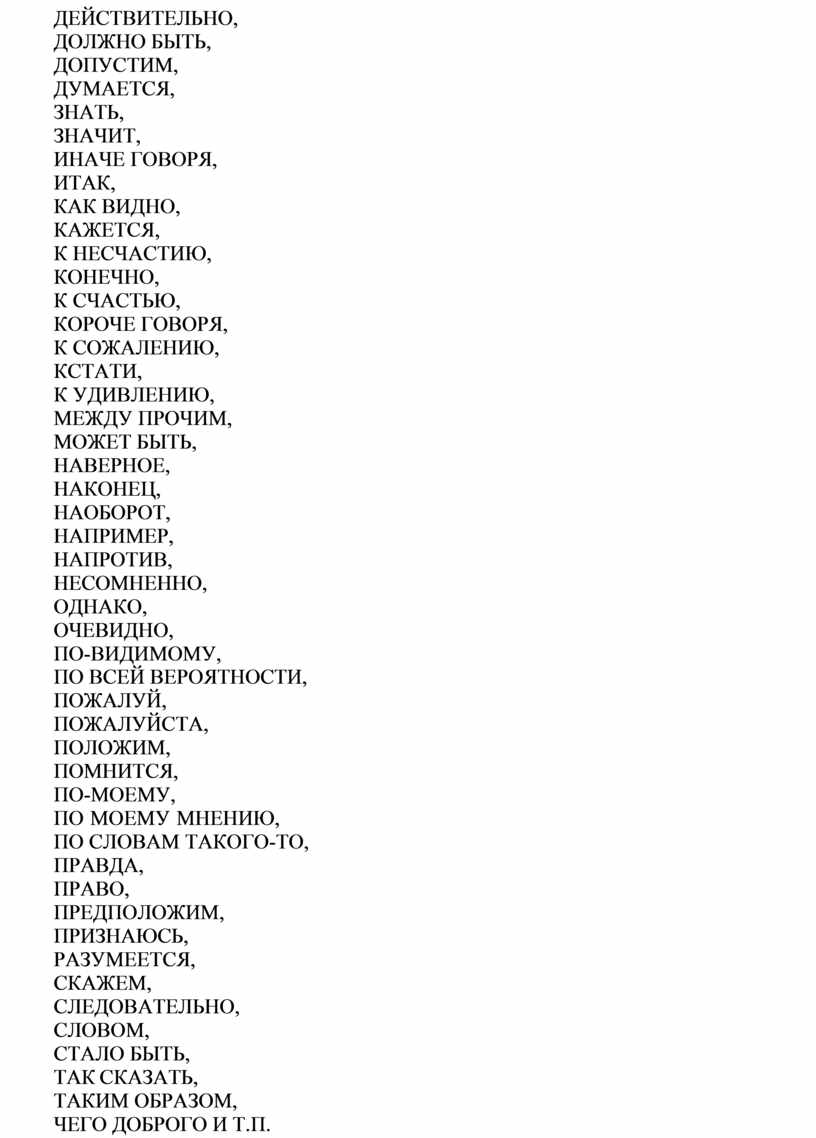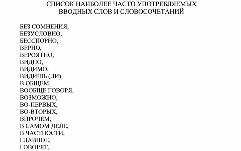 СПИСОК НАИБОЛЕЕ ЧАСТО УПОТРЕБЛЯЕМЫХ ВВОДНЫХ СЛОВ И СЛОВОСОЧЕТАНИЙ