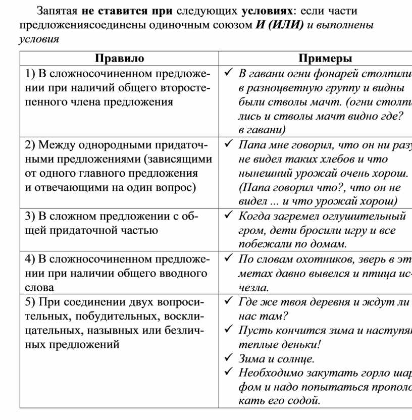 Запятая не ставится при следующих условиях: если части предложения соединены одиночным союзом И (ИЛИ) и выполнены условия