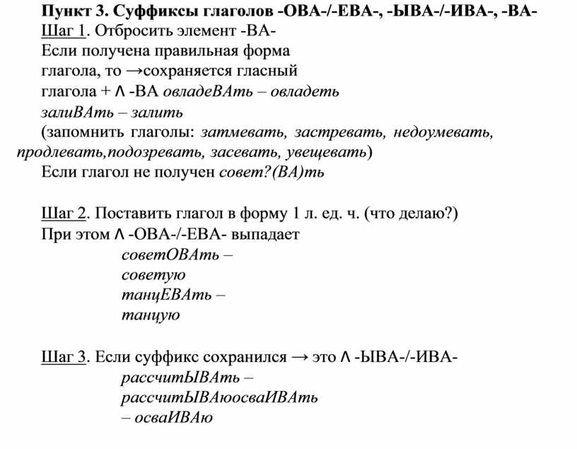 Пункт 3. Суффиксы глаголов -ОВА-/-ЕВА-, -ЫВА-/-ИВА-, -ВА-