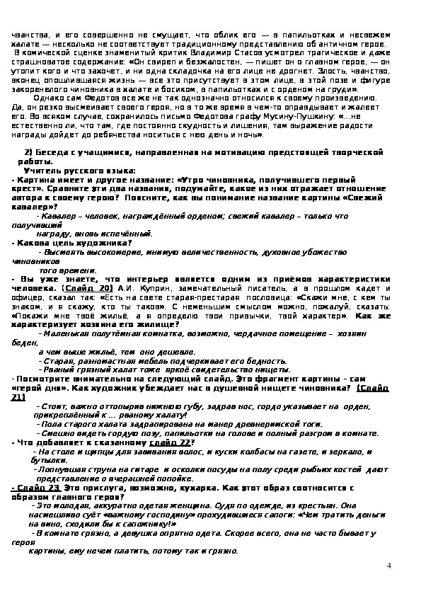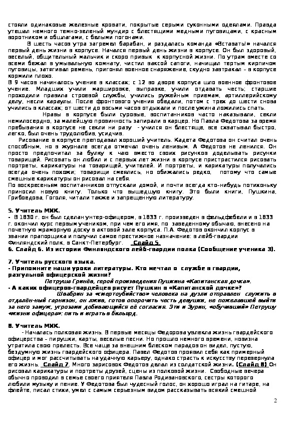 Интегрированный урок по искусству и литературе о творчестве великого русского художника и офицера Павла Федотова может быть полезен учителям - предметникам, школьным организаторам, учащимся и их родителям.Главная цель урока- познакомиться с личностью и творчеством Федотова; представить офицера, живописца П.А. Федотова как разносторонне развитого человека своего времени; доказать значимость образа Федотова для формирования у кадетов компетентностного подхода в патриотическом воспитании.
