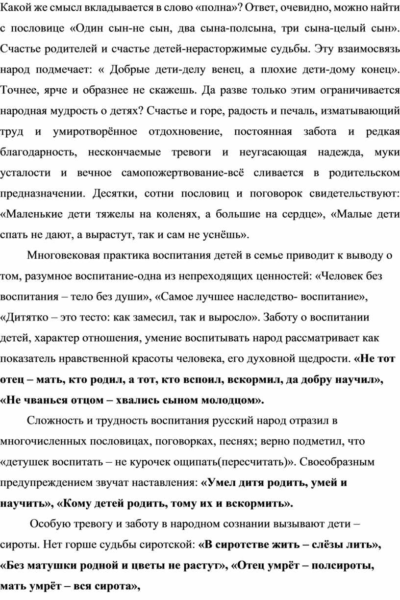 Какой же смысл вкладывается в слово «полна»? Ответ, очевидно, можно найти с пословице «Один сын-не сын, два сына-полсына, три сына-целый сын». Счастье родителей и счастье детей-нерасторжимые судьбы. Эту взаимосвязь народ подмечает: « Добрые дети-делу венец, а плохие дети-дому конец». Точнее, ярче и образнее не скажешь. Да разве только этим ограничивается народная мудрость о детях? Счастье и горе, радость и печаль, изматывающий труд и умиротворённое отдохновение, постоянная забота и редкая благодарность, нескончаемые тревоги и неугасающая надежда, муки усталости и вечное самопожертвование-всё сливается в родительском предназначении. Десятки, сотни пословиц и поговорок свидетельствуют: «Маленькие дети тяжелы на коленях, а большие на сердце», «Малые дети спать не дают, а вырастут, так и сам не уснёшь».