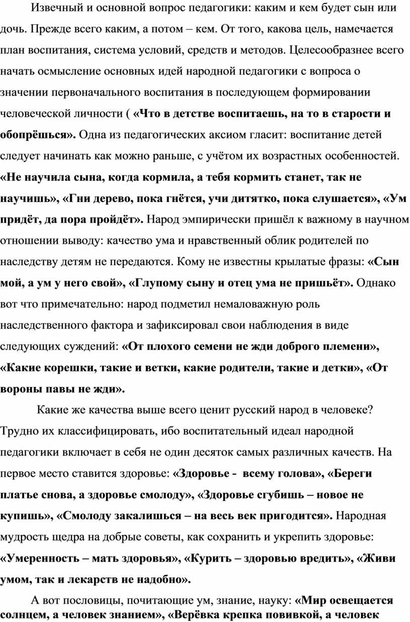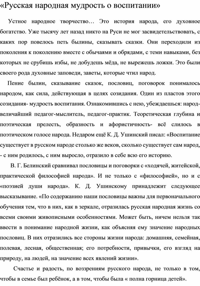 Пение былин, сказывание сказок, пословиц, поговорок понималось народом, как сила, действующая в целях созидания. Один из пластов этого созидания- мудрость воспитания. Ознакомившись с нею, убеждаешься: народ-величайший педагог-мыслитель, педагог-практик. Теоретическая глубина и поэтическая прелесть, образность и афористичность- всё слилось в поэтическом голосе народа. Недаром ещё К. Д. Ушинский писал: «Воспитание существует в русском народе столько же веков, сколько существует сам народ, - с ним родилось, с ним выросло, отразило в себе всю его историю.