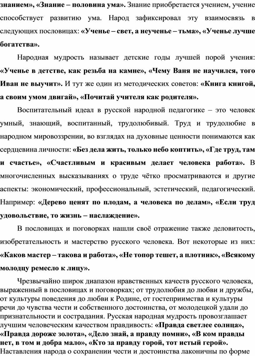 Чрезвычайно широк диапазон нравственных качеств русского человека, выраженный в пословицах и поговорках; от трудолюбия до любви и дружбы, от культуры поведения до любви к Родине, от гостеприимства и культуры речи до чувства чести и собственного достоинства, от молодецкой удали до признательности и сострадания. Русская народная мудрость провозглашает лучшим человеческим качеством правдивость: «Правда светлее солнца», «Правда дороже золота», «Дело знай, а правду помни», «В ком правды нет, в том и добра мало», «Кто за правду горой, тот истый герой». Наставления народа о сохранении чести и достоинства лаконичны по форме и глубоки по содержанию: За честь хоть голову снесть», «Бесчестье хуже смерти», «Добрая слава дороже богатства», «Любовь к Родине сильнее смерти», «Человек без Родины – соловей без песни».